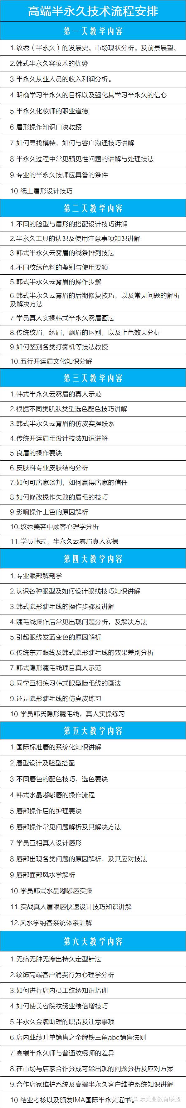 化妆师必会的一门技能:韩式半永久定妆术随着时尚行业的发展,韩式半永久横空出世,然而很多化妆师还没有看到韩式半永久的潜力。当今美业再牛的化妆师一个妆面也很难超越10000元,一个再牛的美发师一个发型也很难超越10000元,而一个厉害的纹绣师一对眉毛可以过20000.......这就是行业的趋势。 身为化妆师的您,还在犹豫不决吗?当别人都在做顾客挣钱,你还在观望,不确定吗? 去北京、韩国学习,路费、食宿费用开销大?不再担心,来时尚魅影专修,在本地即可学习到名师课程。 韩式半永久纹绣课开课了!毕业后颁发资格证书! 此次课程学费为3980元,含括半永久练习册、基本练习工具、服装、模特头及仿真皮等;所有学员毕业将颁发半永久证书,并享受免费复训。本期名额有限。 高端半永久实操花絮 高端半永久师资团队