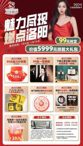 为了答谢粉丝和新老学员对洛阳时尚魅影职业培训学校的厚爱,我校特举办2024大型宠粉节,支付99元即可抢订价值5999元技能大礼包。 七大宠粉福利等你来抢! 报名时间:2024年1月8日 - 2024年1月19日 激活时间:2024年1月20日 - 2024年1月22日 宠粉福利: 1、支付的99元抵500元学费; 2、送一周课程,价值1680元。课程任选,但不能与现有赠送课程叠加; 3、下单送价值108元双层蒸煮一体锅; 4、两人同行,每人再额外送一个小黄鸭暖暖杯; 5、线下报课可抽幸运大转盘,100%中奖;