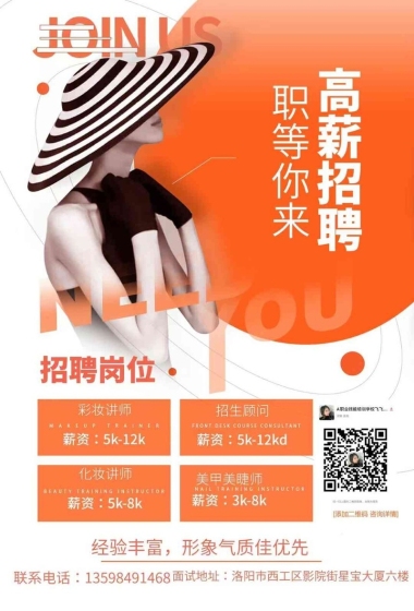 因我校课程拓展需求,现诚聘彩妆讲师、化妆讲师、美甲美睫师和招生专员。要求有良好的职业操守和团队合作精神,专业不限、男女不限,待遇从优,具体待遇面谈。学校电话:0379-63625352、400-6869-822