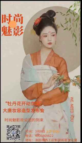 进入三月,春意盎然,我校将于3月8日上午9点,举办大唐妆容造型发布会,本次发布会的主题为“牡丹花开动京城”。本次发布会以驰名中外的洛阳牡丹花为妆容核心,配上当今最流行的汉服唐装造型,让与会者都能感受到十三朝古都洛阳的神都魅力!本次公开课的主讲老师为 小智老师,他擅长各类古装和影视装造型。聚焦时尚魅影大唐妆容造型发布会,3月8日上午9点我们不见不散,热诚期待你的到来!相关课程 汉服唐装精英班