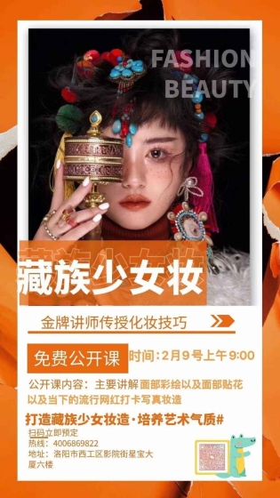 2月9日上午9点,我校将举办免费美妆公开课,本次公开课的主题为“藏族妆容”。藏族妆容现在非常受大众欢迎,浓墨重彩的民族妆造,塑造不一样的美!如果你对本次公开课内容感兴趣,可以先电话预约,预约电话:400-6869-822、0379-63625352.本次公开课的主讲老师为 小智老师,他擅长各种各种古装和影视装造型。热诚欢迎你的到来,让我们2月9日上午9点在时尚魅影学校的6楼大教室不见不散!